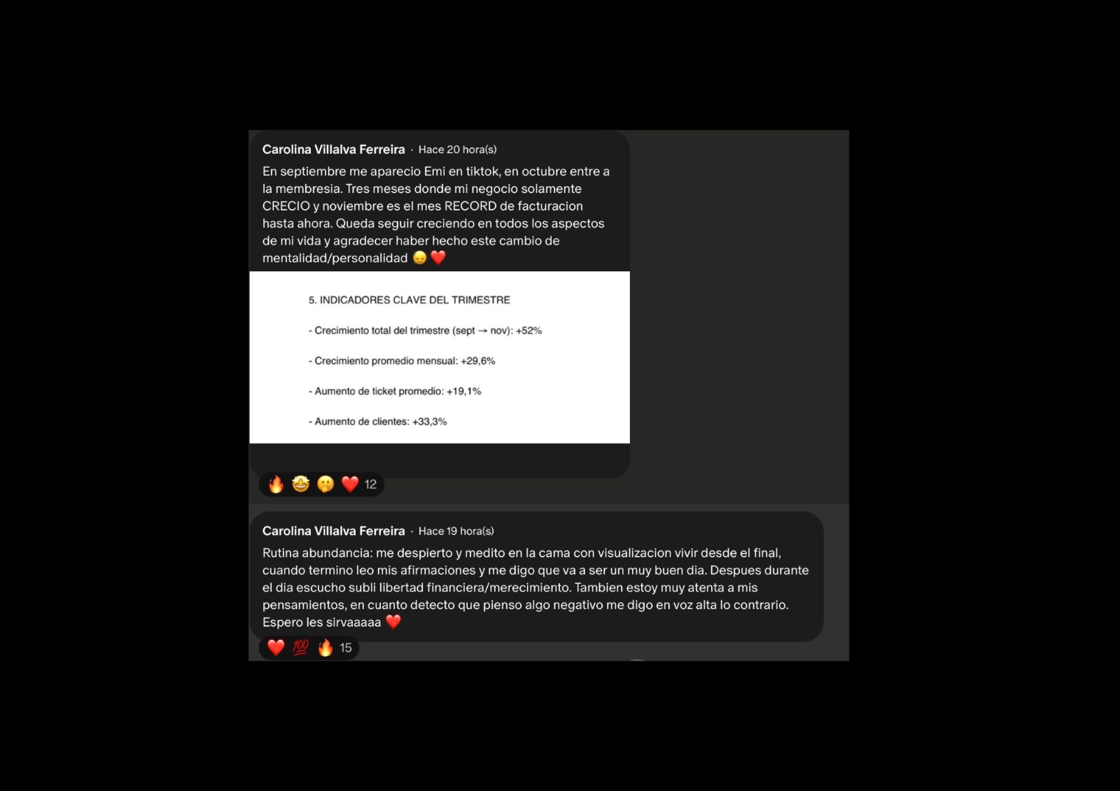 Me tomo solo 1 mes aplicar todo lo que mi intuición me habia dicho, suena magico y de locos, pero no soy de las personas que creen en cosas magicas, solo hice sin pensar lo peor, actue todos los dias como esta nueva versión. En 1 mes estaba facturando mas dinero que en mi trabajo anterior y que mis ex jefes y ex compañeros juntos. Empece a dar sesiones 1:1 pero llegaron a servmuchas e ingestiónables, asi que decidi abrir una comunidad privada para ayudarte en este proceso.