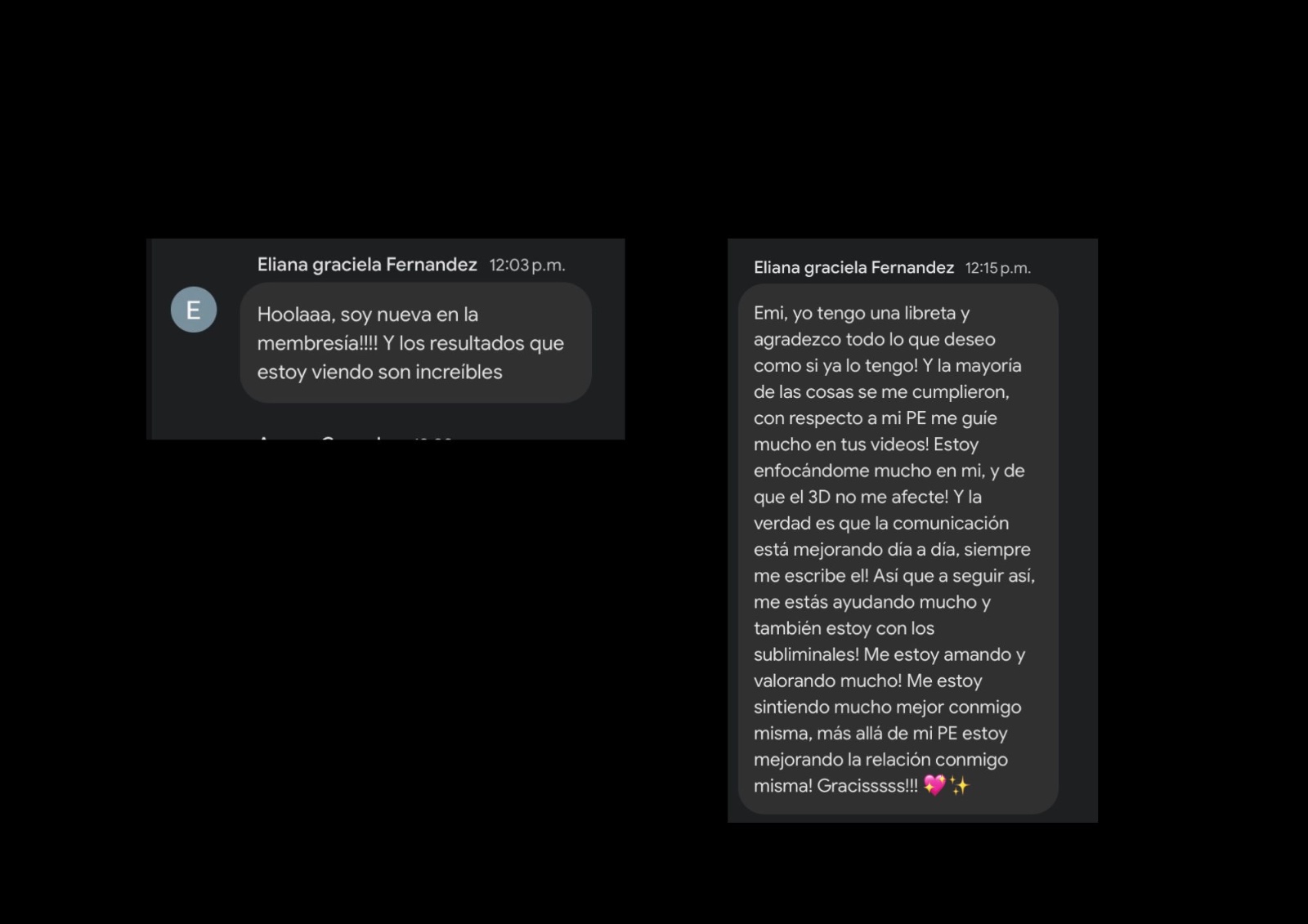Encontraras diversos modulos para potenciar tu vida. En cada modulo habra herramientas como subliminales silenciosos, meditaciones o visualizaciones o ejercicios ademas de una comunidad privada para agotar dudas y conectarte con otras personas y con Emi 2 veces por mes en charlas abiertas.